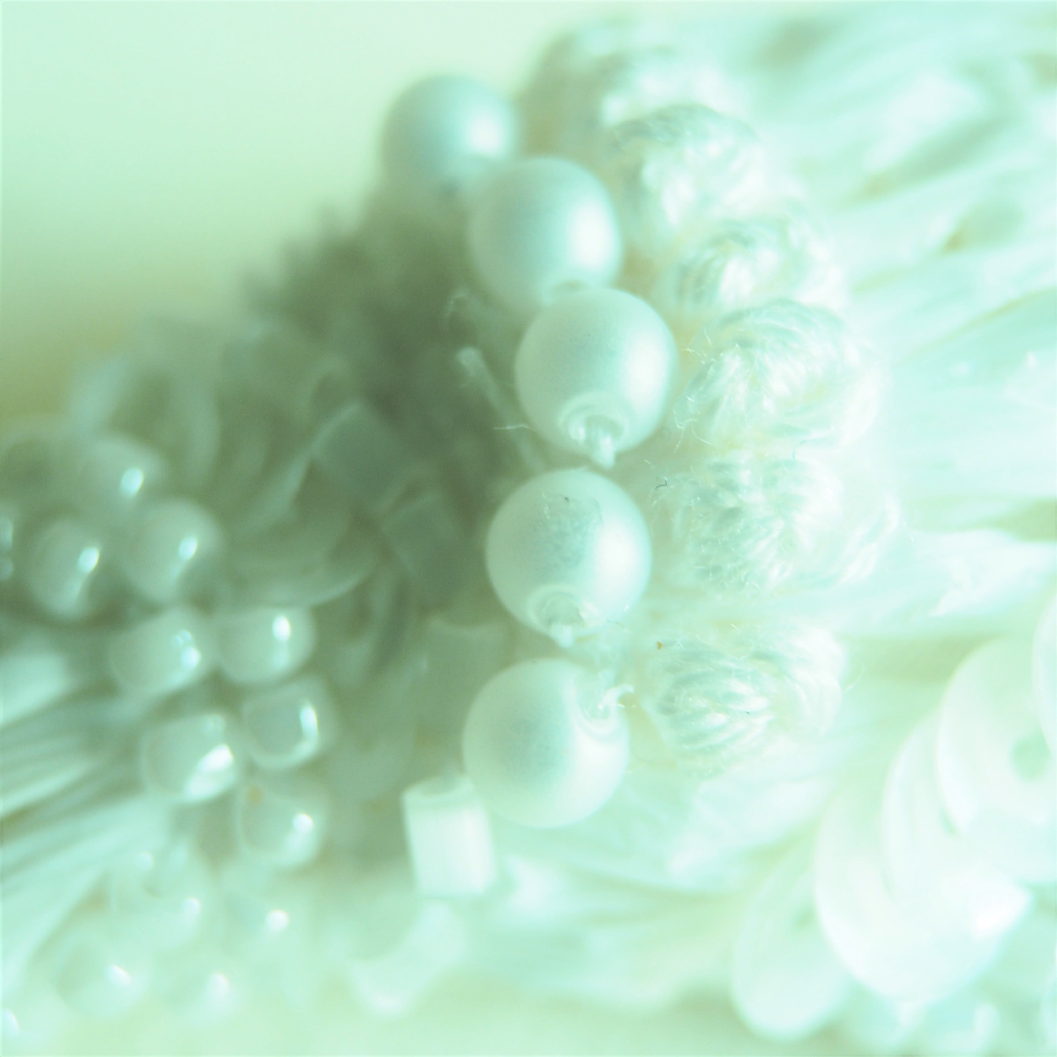 刺繍:フランス製スパンコール、日本製ビーズ、模造パール、モール糸、アンダリア、綿糸
